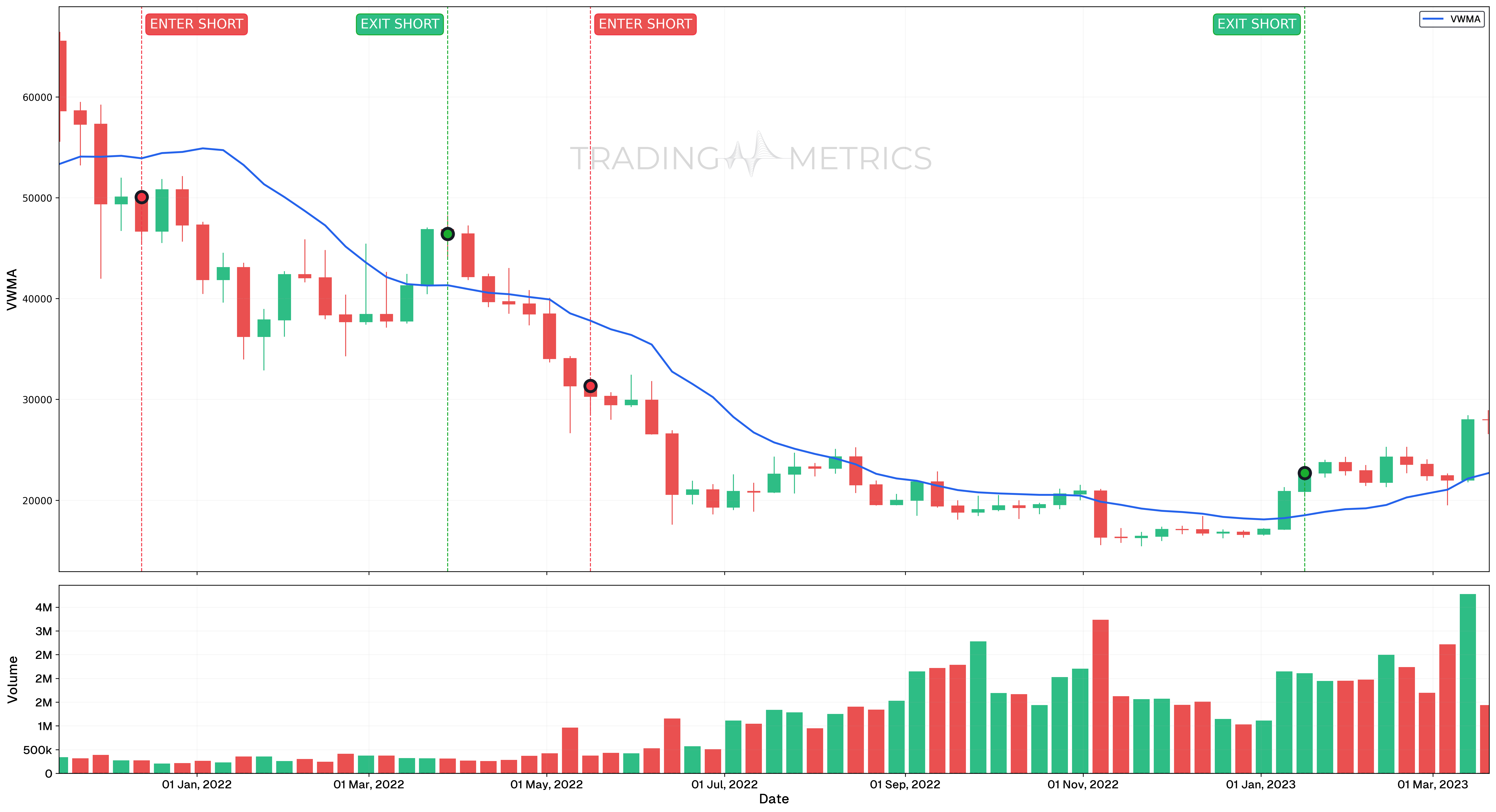 • Exit Signal: A short position exit is indicated when the VWMA falls below the entire candlestick, including the low. This occurred on March 28, 2022, suggesting the end of the downward trend and an ideal exit point.
