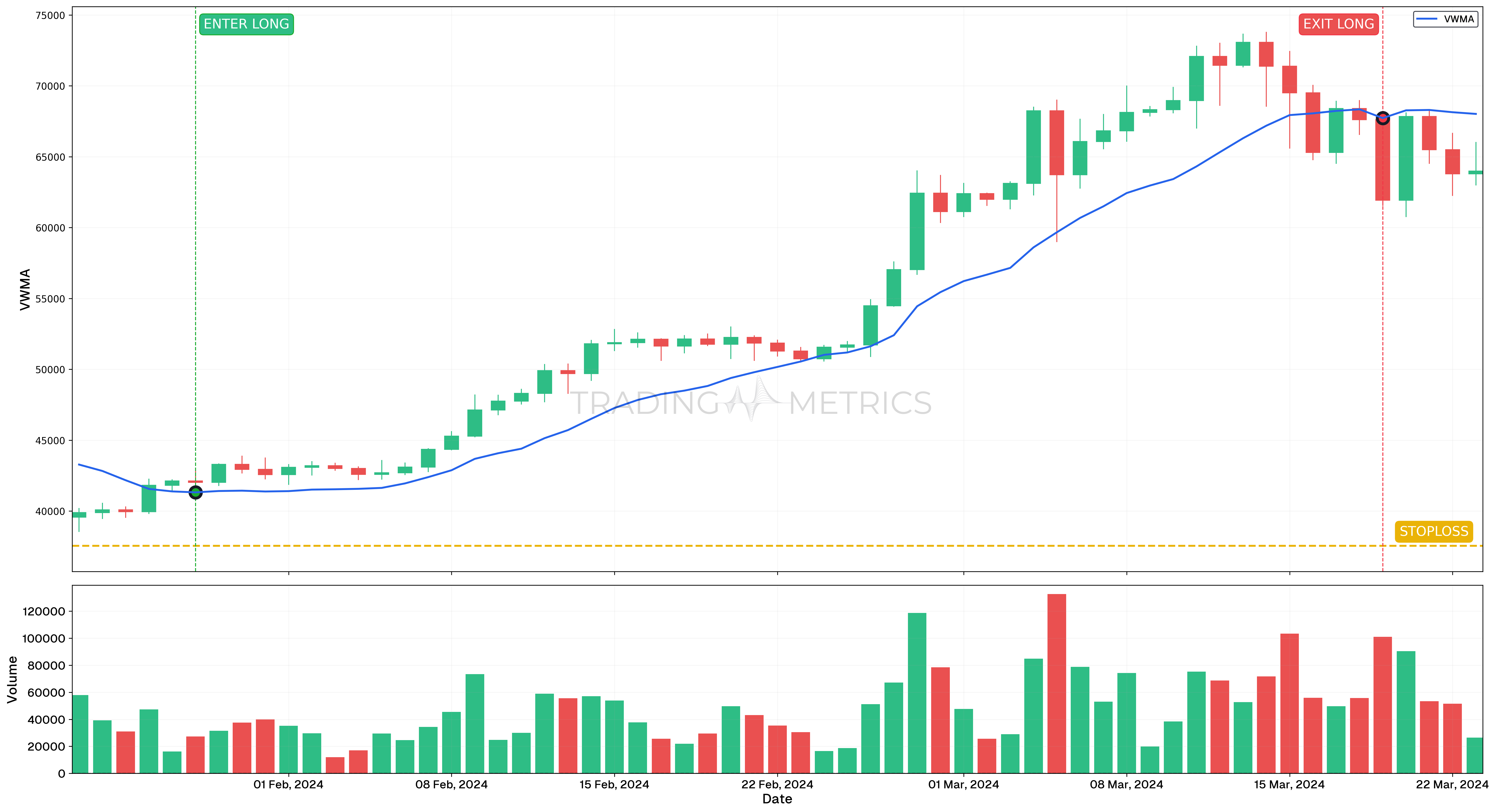 • Exit: Position closed on March 19, 2024, when the VWMA rose above the candlestick, signaling potential downward movement.