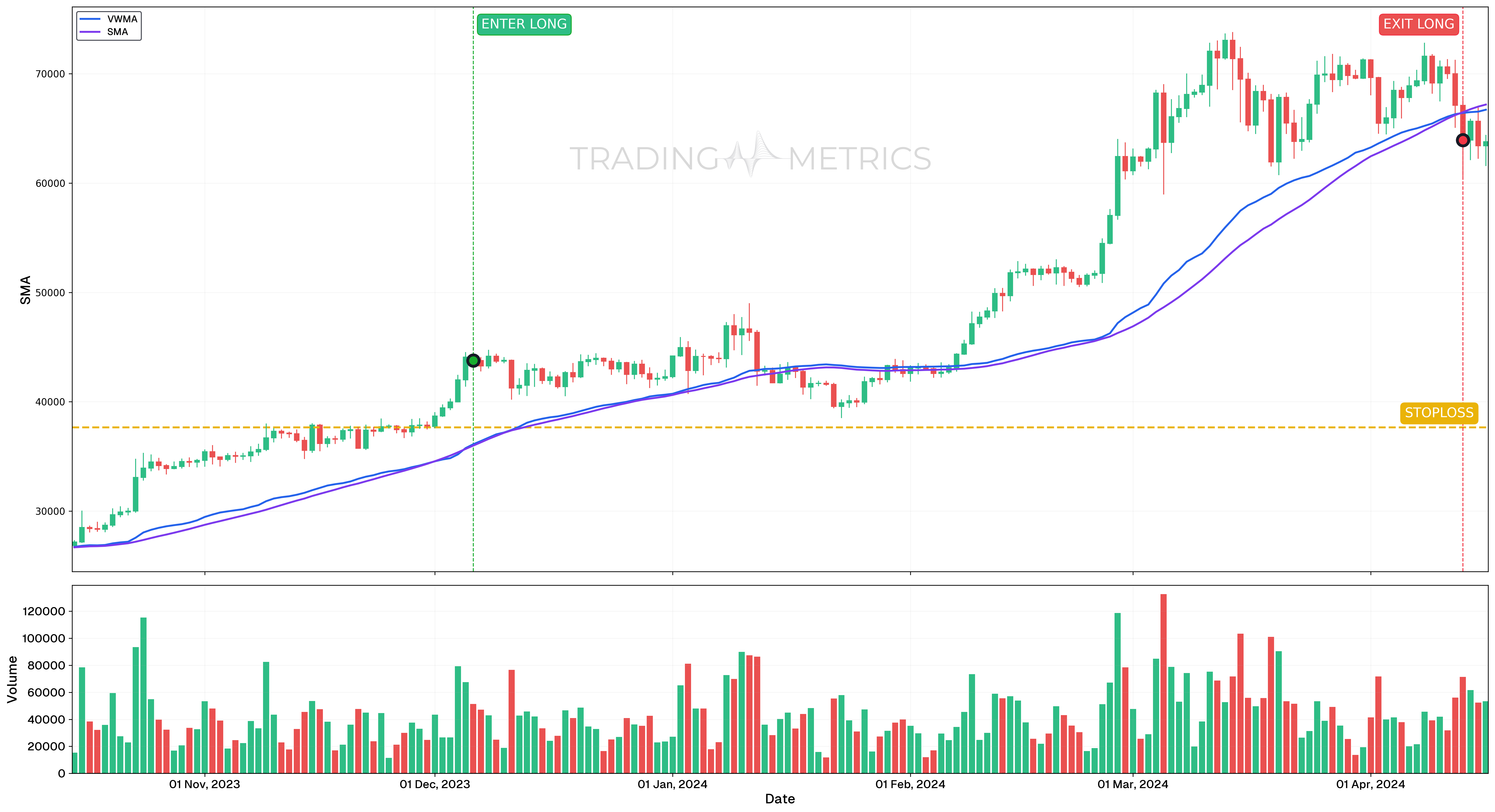 • Outcome: Between the buy signal on December 6, 2023, and the sell signal on April 13, 2024, the price increased by 45.04%, demonstrating the effectiveness of the VWMA/SMA crossover strategy.