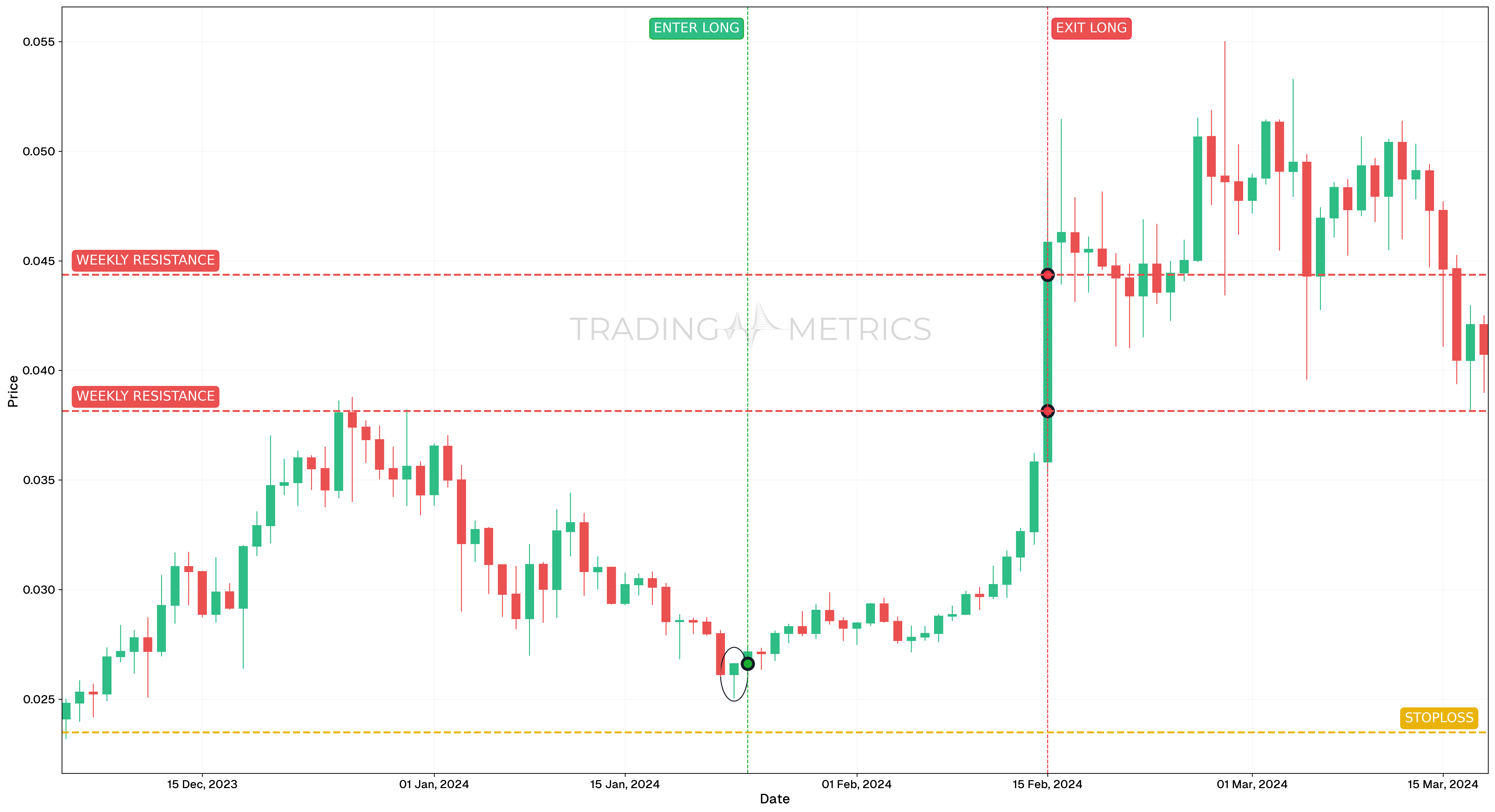 Entry: Entered on January 24, 2024, at $0.02348 following confirmation of the Hammer. Signals included: