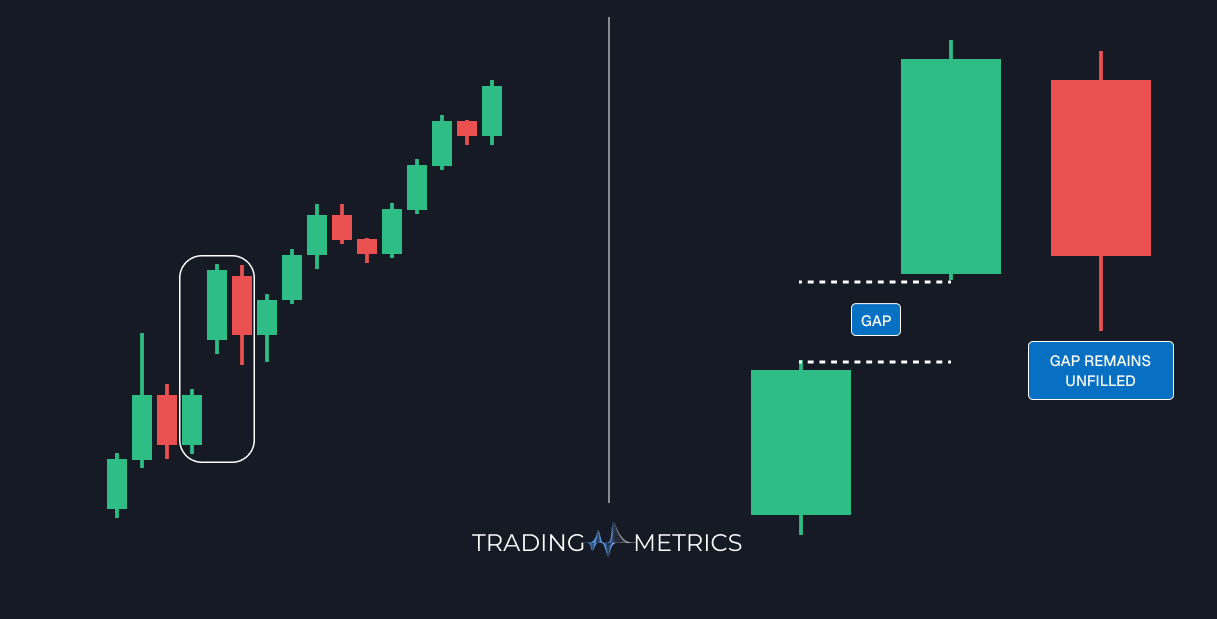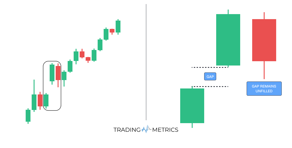 Continuation Patterns where a counter candle confirms the move without closing the gap.
