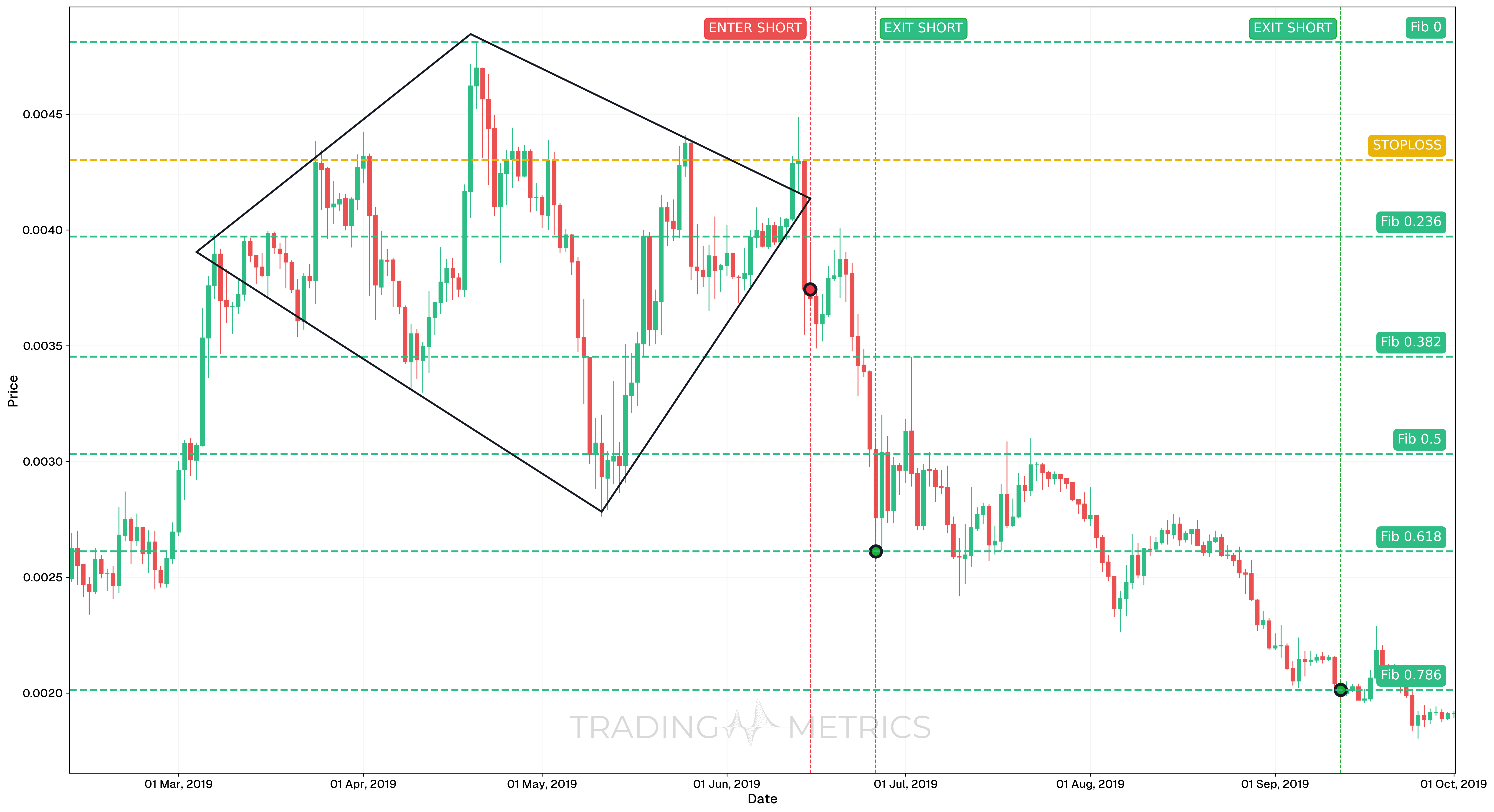 Entry: The short position was entered on June 15, 2019, at 0.004303, shortly after price broke below the lower edge of the Diamond Top structure. Entry was supported by: